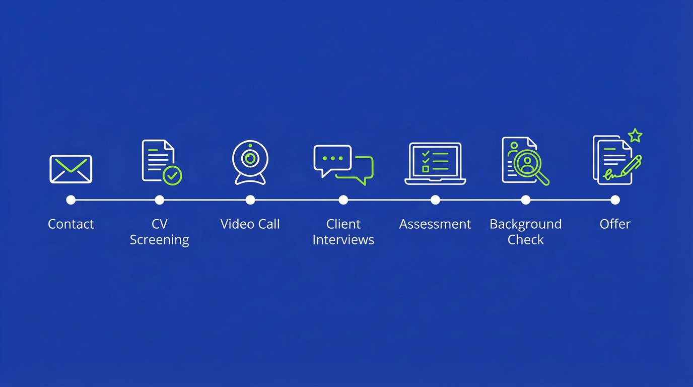 This will vary by client, but can be a single or multi-stage process to evaluate your technical proficiency, problem-solving abilities, and cultural fit.