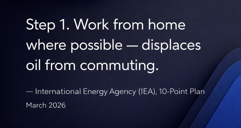 This time, the push is coming from the International Energy Agency (IEA). In their March 2026 10-point action plan to address energy volatility, they urge governments, businesses, and households to work from home wherever possible.